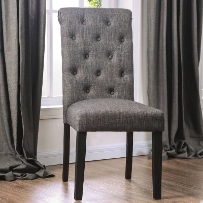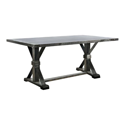 The double pedestals of this five piece dining set feature striking trestle style bases with diagonal riveted metal supports for an Industrial design style. The rectangular table offers a spacious tabletop for entertaining with its four comfortable chairs. Offering a Rustic vibe, this inviting set features an antique black finish with light distressing that lends a vintage feel to the dining set. Chairs boast rolled backs with linen-look fabric upholstery and button tufting that ensure comfort and support for long evenings around the table.