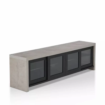 Modern entertaining calls for nuanced vibes that reflect on style and add function. Designed with a cozy cement-like frame the Homes: Inside + Out Briggin Industrial 70″ Tv Stand in Black by HOMES: Inside + Out is a wonderfully unique creation. The doors conveniently slide and feature glass inserts so you can see through to your belongings. Store electronics, movies, and more in the multiple roomy shelves and enjoy the charm and practicality of this piece.