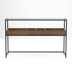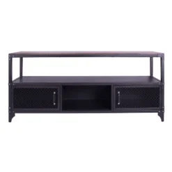 Inspired by treasure chests, the Millan Trunk Style Sofa Table by Homes: Inside + Out refines the style, adding sleek industrial touches. Resting on a dark metal frame, the plank style trunk opens to reveal spacious storage. Use the lower shelf to house books, storage baskets or decor as mesh paneling frames the sides. Accentuated by charming nail head trim, sleek buckles, and a dual tone finish, it distinguishes your home aesthetic as it opens up plenty of space for storage and display.